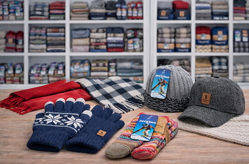 Gorros, guantes, bufandas, chalinas, medias y productos de temporada.