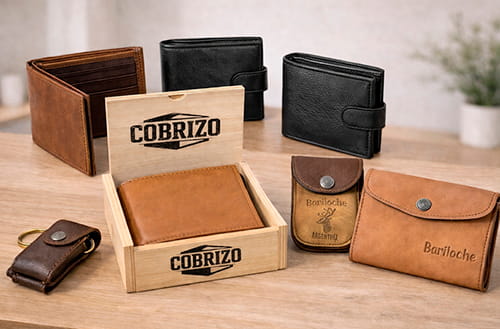 Artículos de cuero como billeteras, ficheros y llaveros.