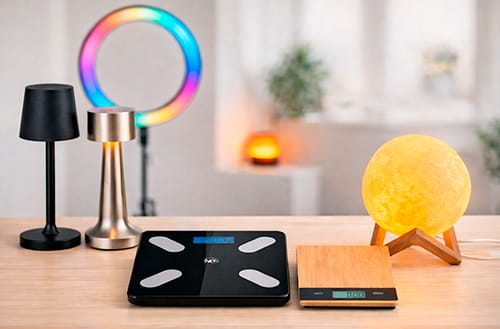 Balanzas, lámparas y artículos importados funcionales para el hogar.
