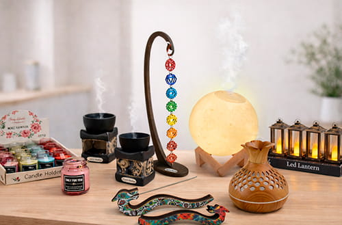 Velas decorativas, hornos, portasahumerios, humidificadores y productos aromáticos.